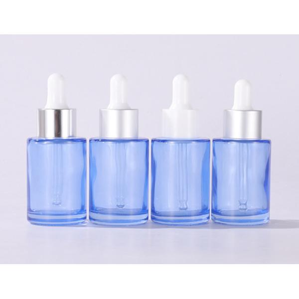 Flast Shoulder 1 Ounce Face Essence Blue Glass Dropper Bottle With Metal Silver Cap